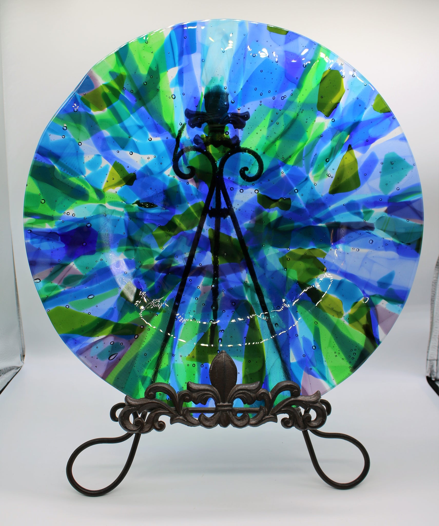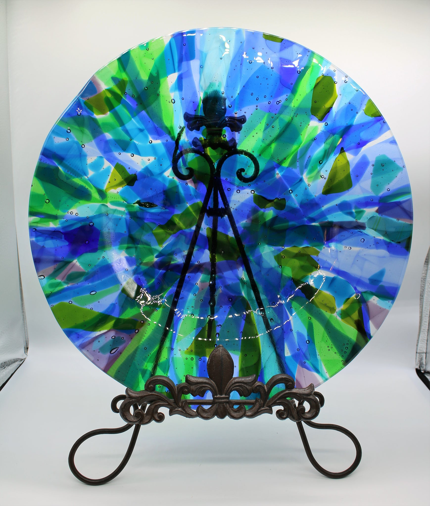 Ocean colored large bowl (15 x 15) produced by stacking and sliding various pieces of glass to form an abstract and unique piece of art. Bowl is very heavy and can be used as stunning accent piece as well as used for a serving piece.