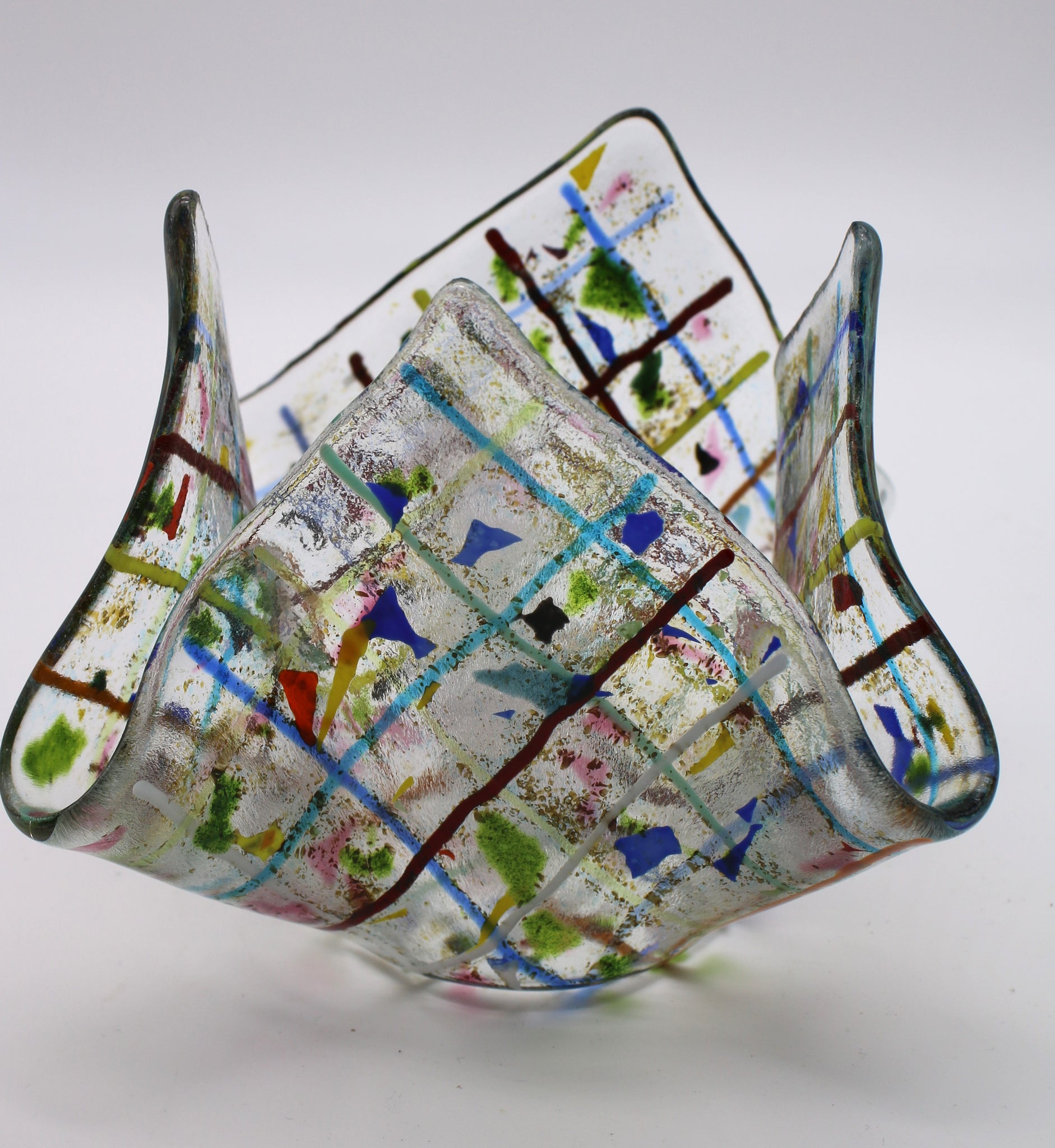 Votive to be used with candle or as a serving piece. Made on rain glass with strips of alternating color stringers and then topped with Mardi Gras color confetti. Votive is a stunning piece of art and absolutely sparkles when candle placed in center. Piece is fired twice in the kiln - Once to join all pieces of glass together and then slumping them over cylinder steel mold. Finished piece measures 4.5 x 4.5 - 2.5 inch square bottom.