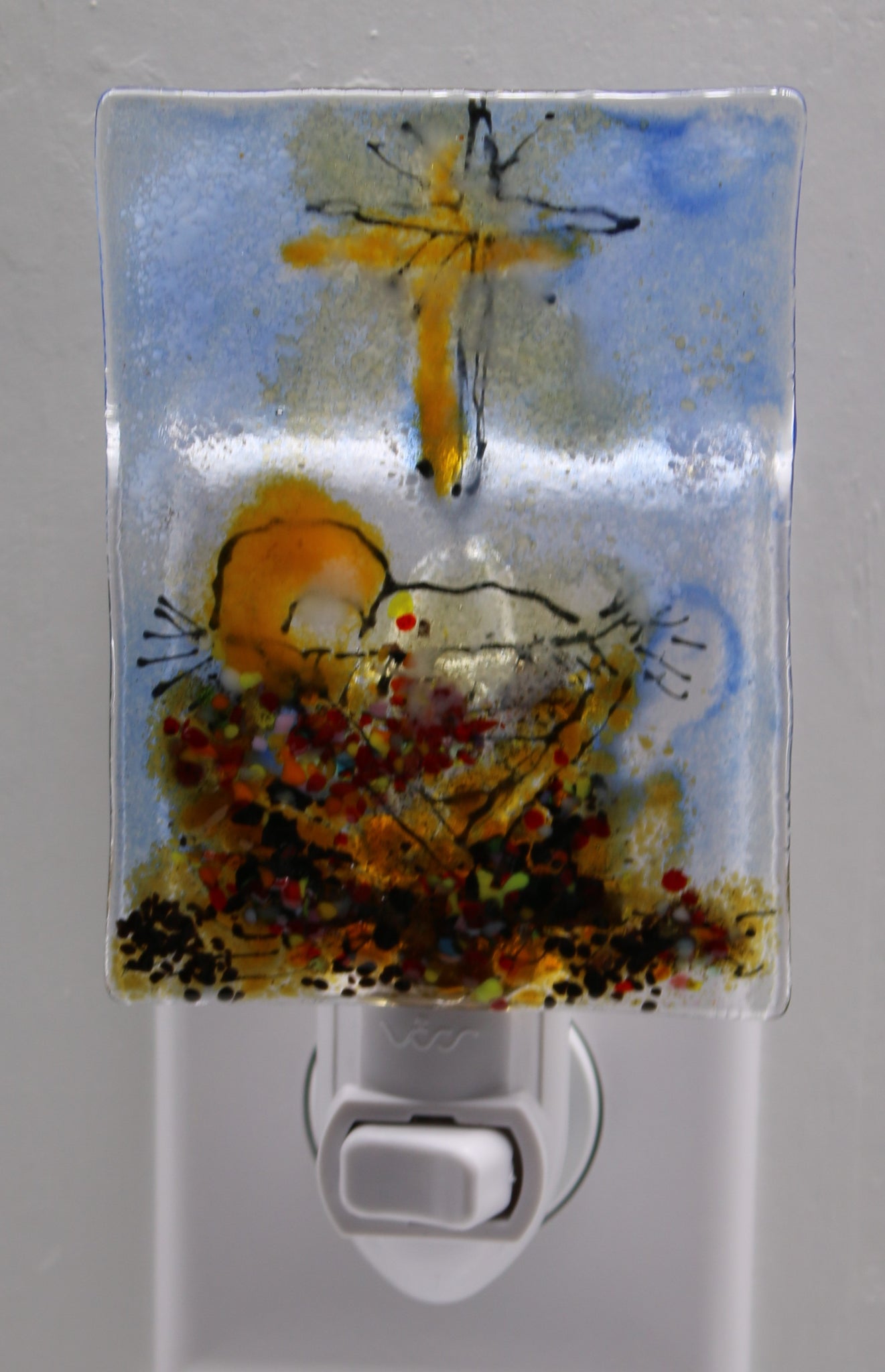 Baby Jesus under star drawn on clear glass. Red, blue, gold, white, black and clear frits and powders used to bring scene to life. Serene and beautiful. Size is 4 x 3