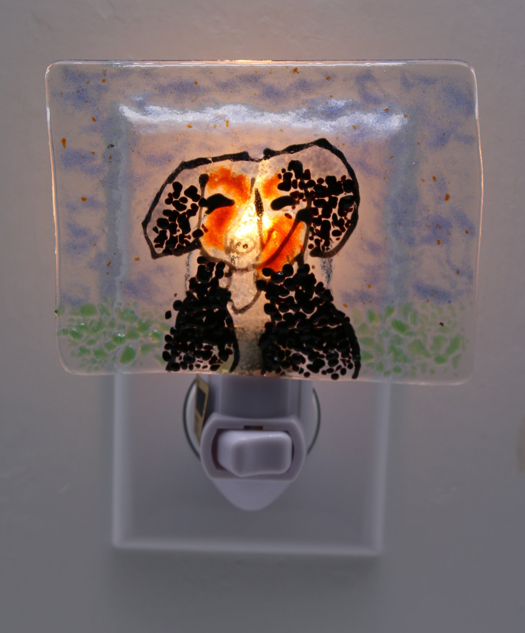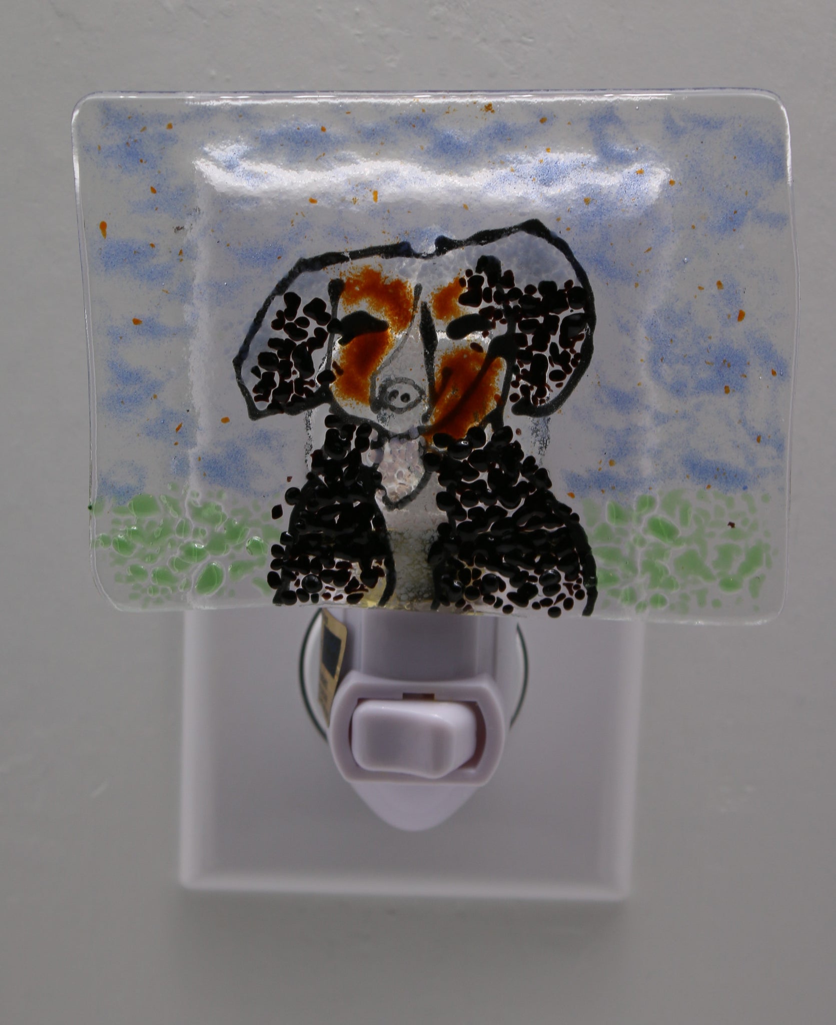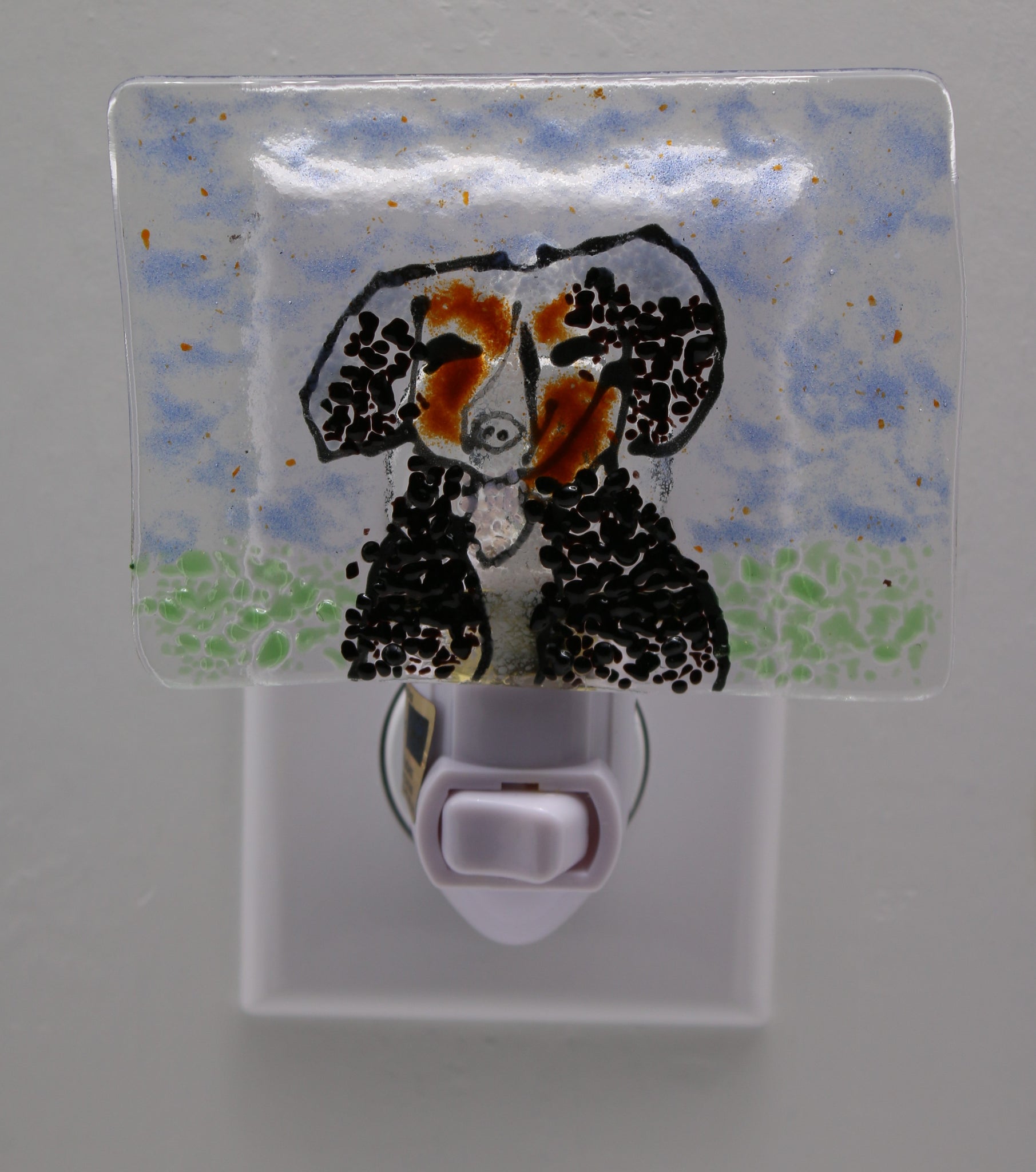 Puppy drawn on clear glass. Brown, black, white, blue and green frit complete this scene. Whimsical and fun night light. Size 3 inch tall by 4 inches wide.