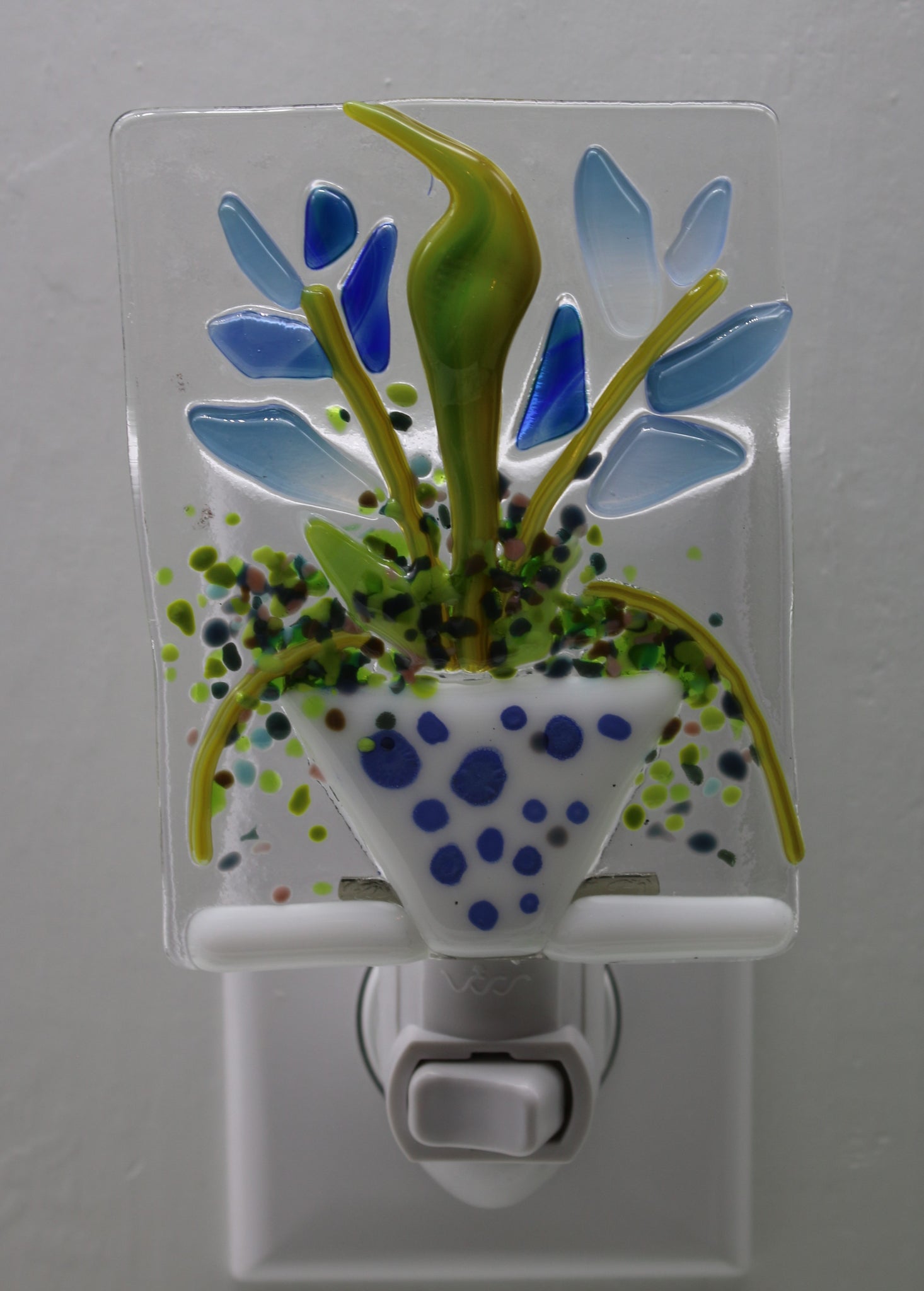 Blue Flower made of blue blown glass pieces - Green Vitrograph pieces make up leaves and stems - mixed Valcox frit - all placed on clear glass. Size is 3.75 x 3 inches wide. So beautiful when it is on or off.