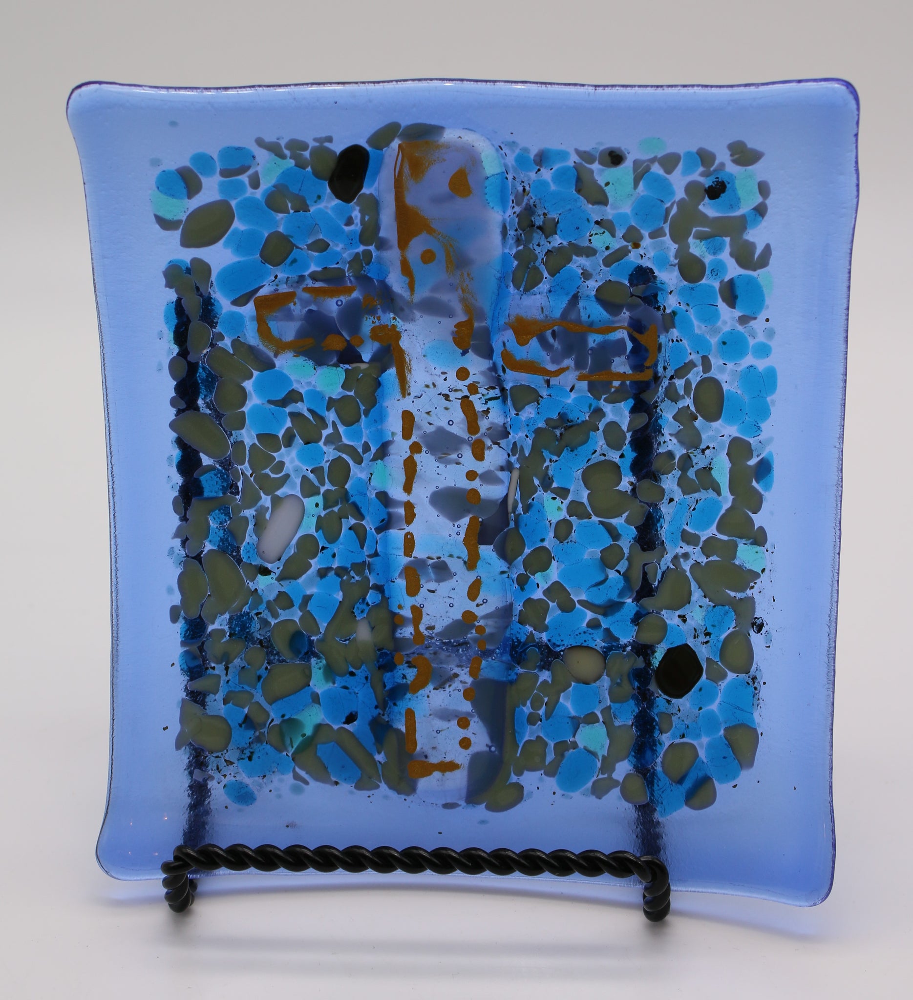 7 x 7 - Square transparent Blue plate - sprinkled with aqua and green frit - Clear cross outlined in gold shows when light shines through plate. Beautiful display or functional small dish.