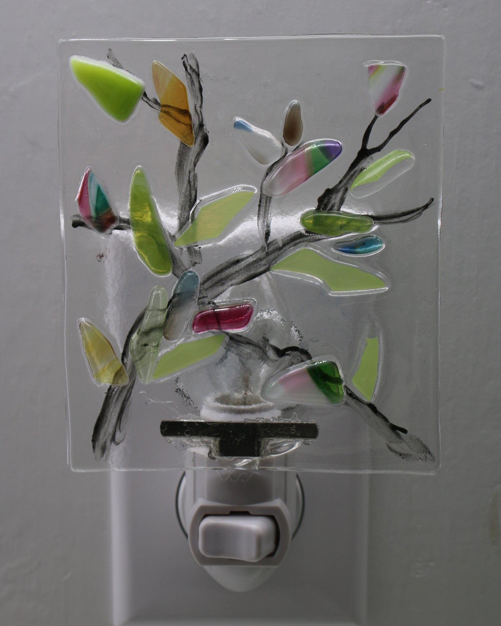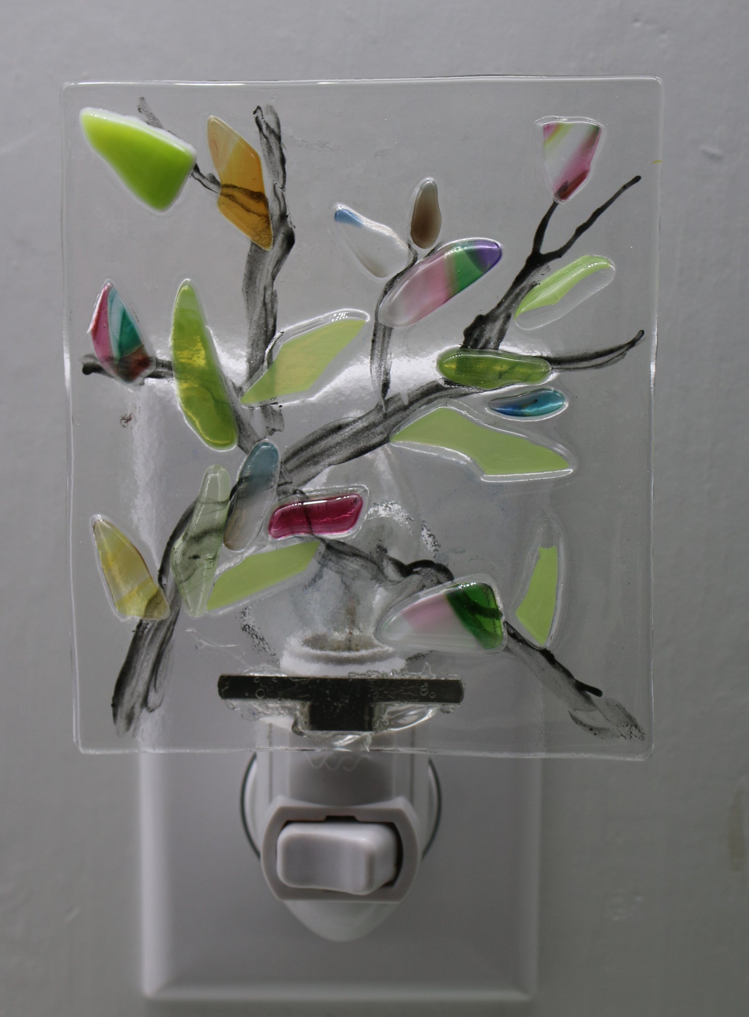 Clear, Pink, lavender and yellow blown glass pieces form flower petals - Green glass pieces form leaves - all placed on clear glass. Size is 3.5 x 4 inches wide. So beautiful when it is on or off.