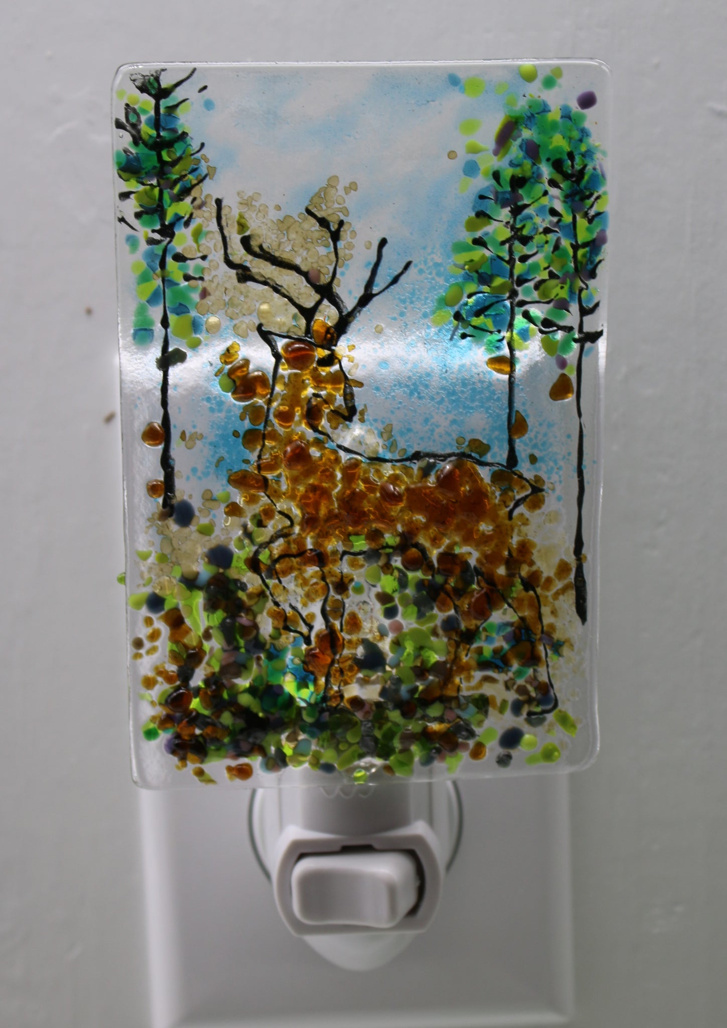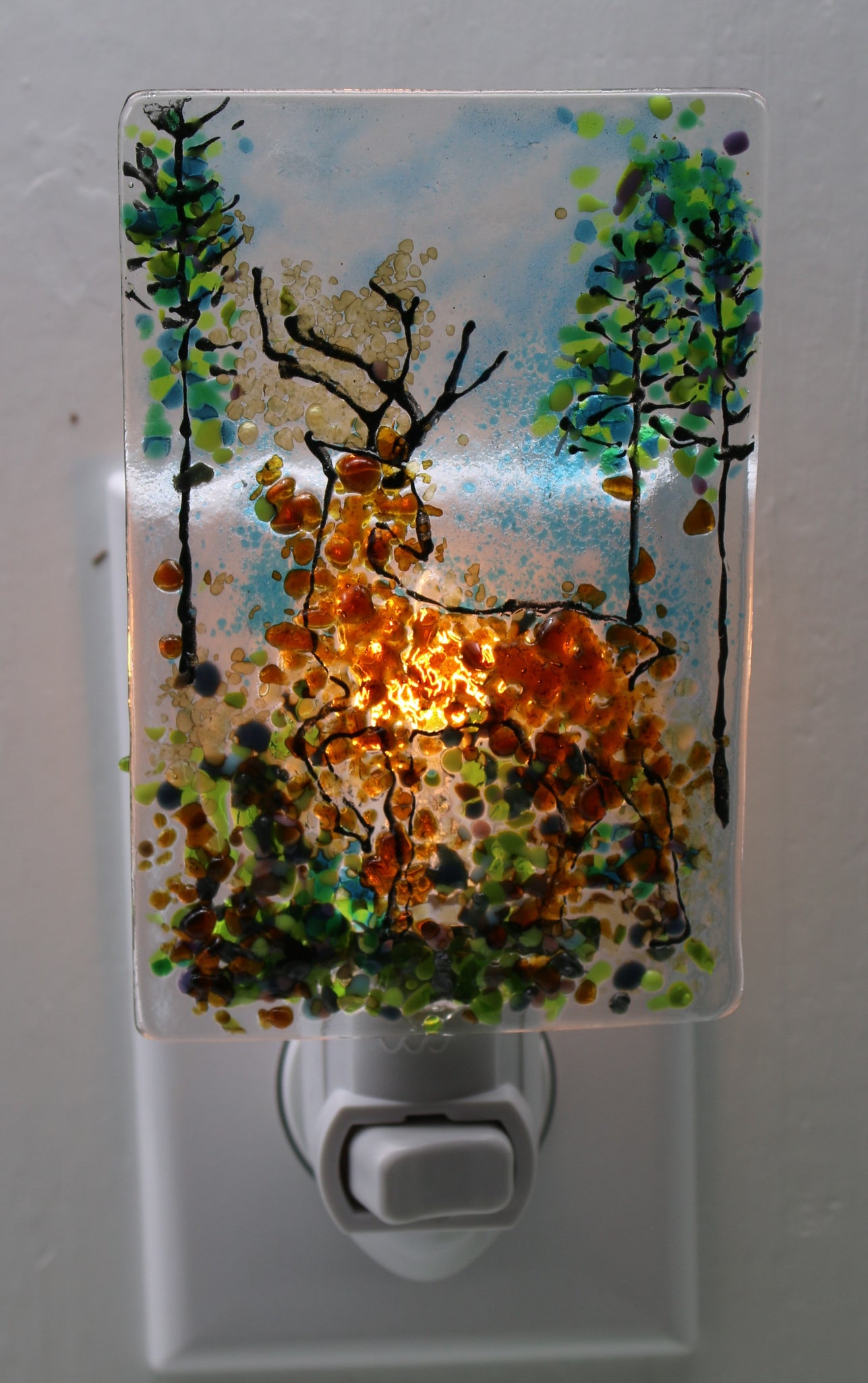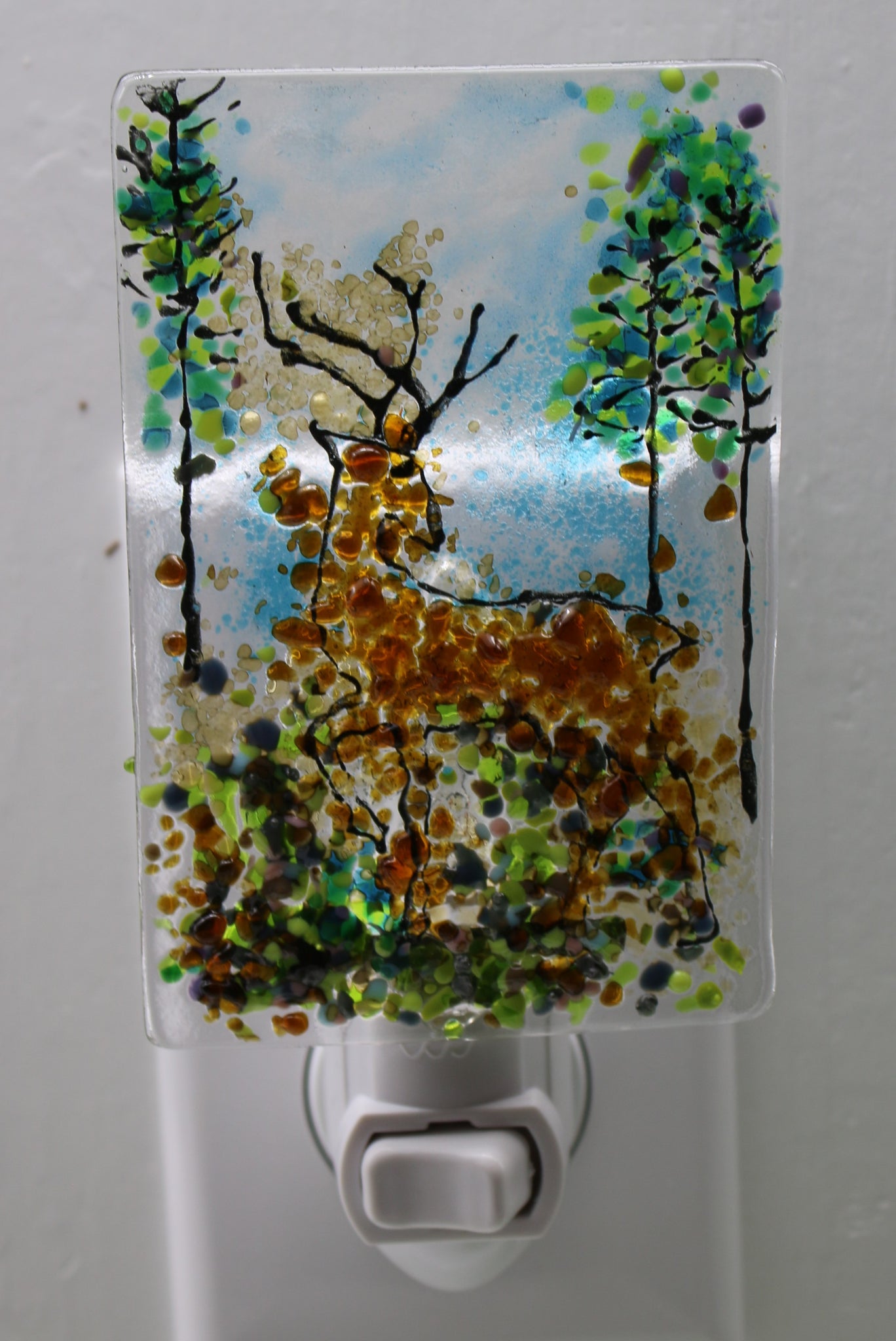 Brown Deer drawn on Clear Glass. Green, yellow, bronze, brown and blue frit complete this scene. Whimsical and fun night light. Size 3 inch tall by 4 inches wide.