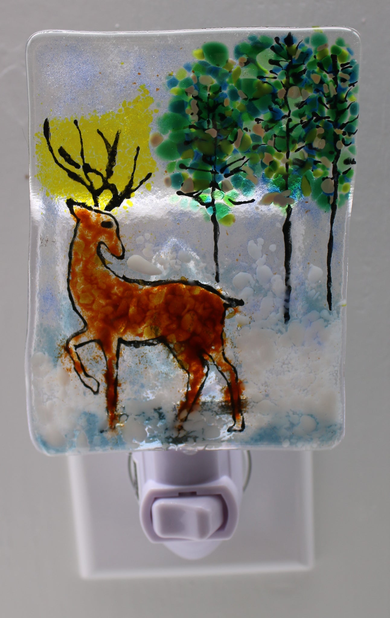 Brown Deer drawn on Clear Glass. Green, yellow, bronze, brown and blue frit complete this scene. Whimsical and fun night light. Size 3 inch tall by 4 inches wide.