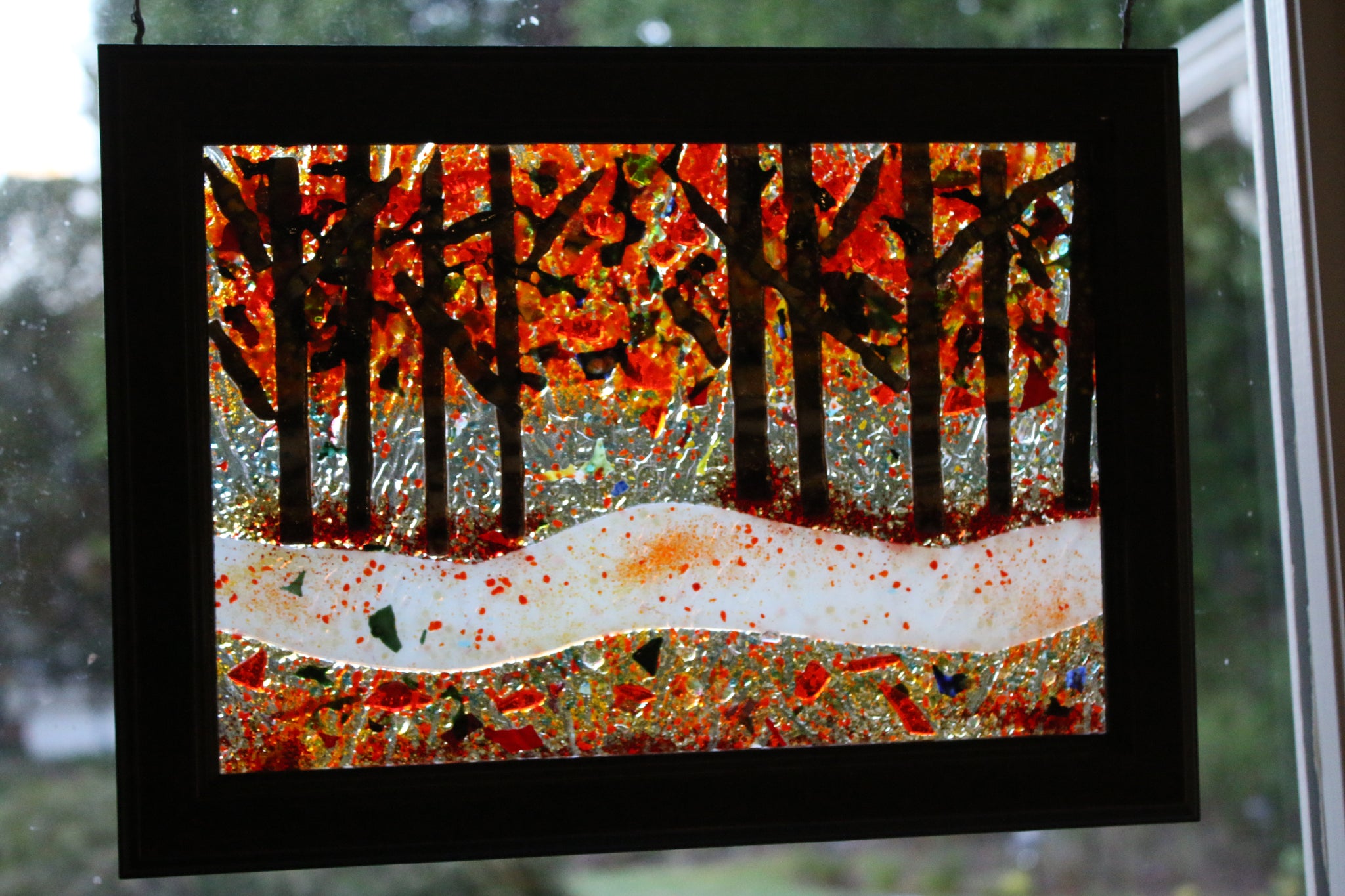 This is one of our landscape seasons plates. This one is our fall plate placed on clear and ridged glass. Trees and path placed and rest of picture developed with various fall colored frit, glass and flakes. Size is 10 x 14 . This can be framed in open frame to hang in a window. If you have our other seasons, this plate can be switched out with another season as they change.. Absolutely beautiful series - One of my favorites.