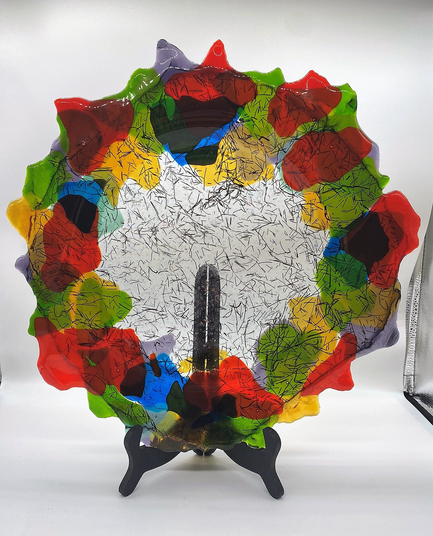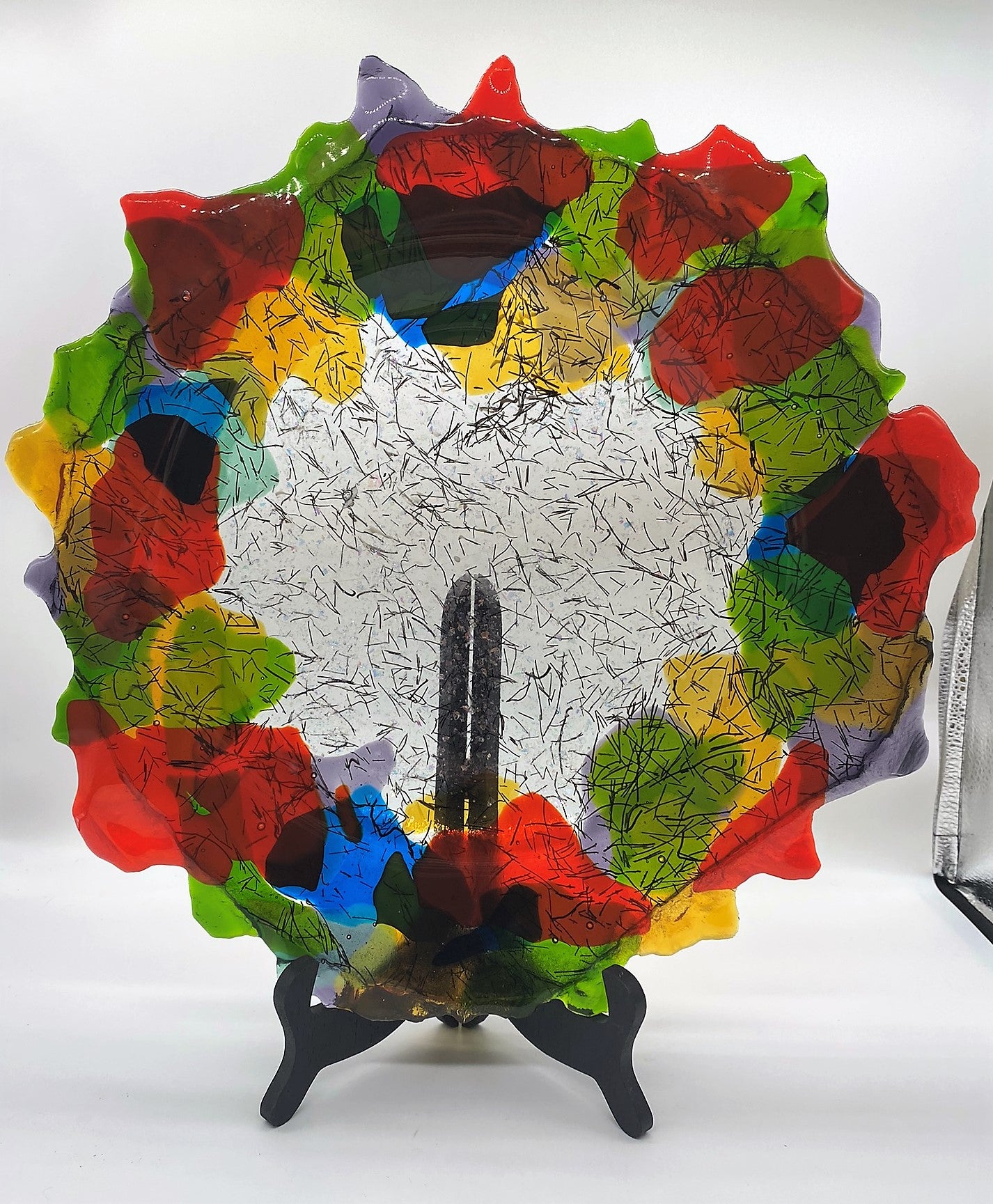 This Bowl was created by using clear primary colors in various shapes around the edge of the bowl. Middle of the bowl is made up of black frit glass with highlights of dichotic sprinkled throughout. Light is reflected off of all the varying heights giving the piece a crystal sparkle Measures 13 x 13 - Heavy piece ( Rod Iron Stand not included)
