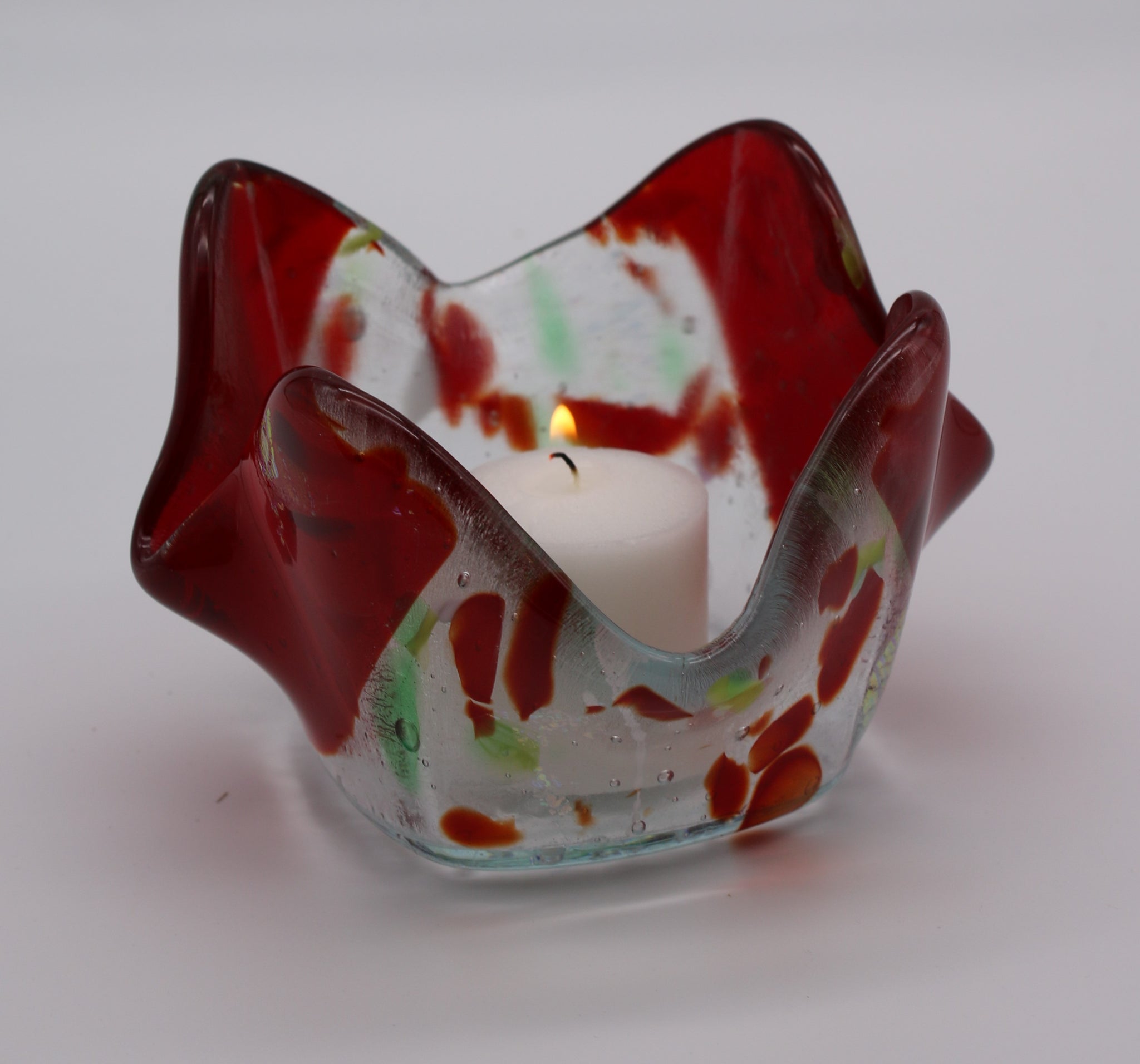 Red, green, and clear candle votive. Piece is made by combining various transparent glass and firing twice. Once to join all pieces of glass together and then slumping them over cylinder steel mold. Thick and heavy piece. Finished piece measures 4.5 x 4.5 - 2.5 inch square bottom.
