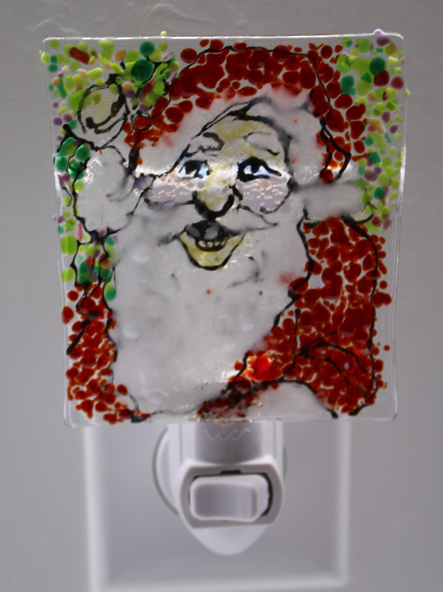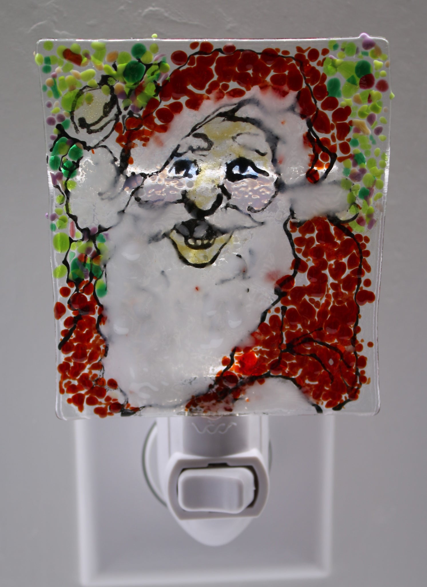 Santa nightlight created by drawing image on clear glass. Red, amber, champagne, white and clear frits and powders used to bring him to life. Whimsical and fun. Size is 3.5 x 3