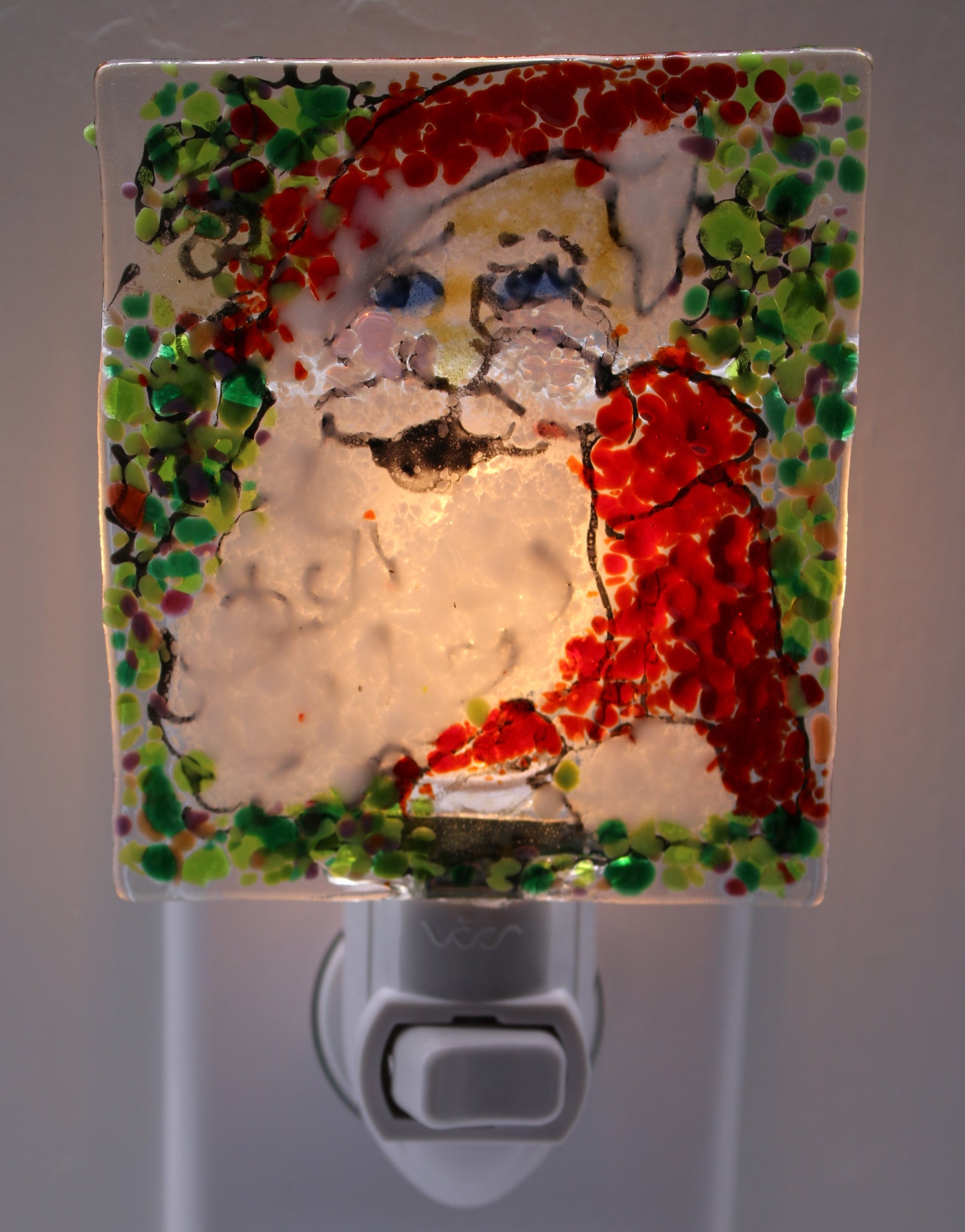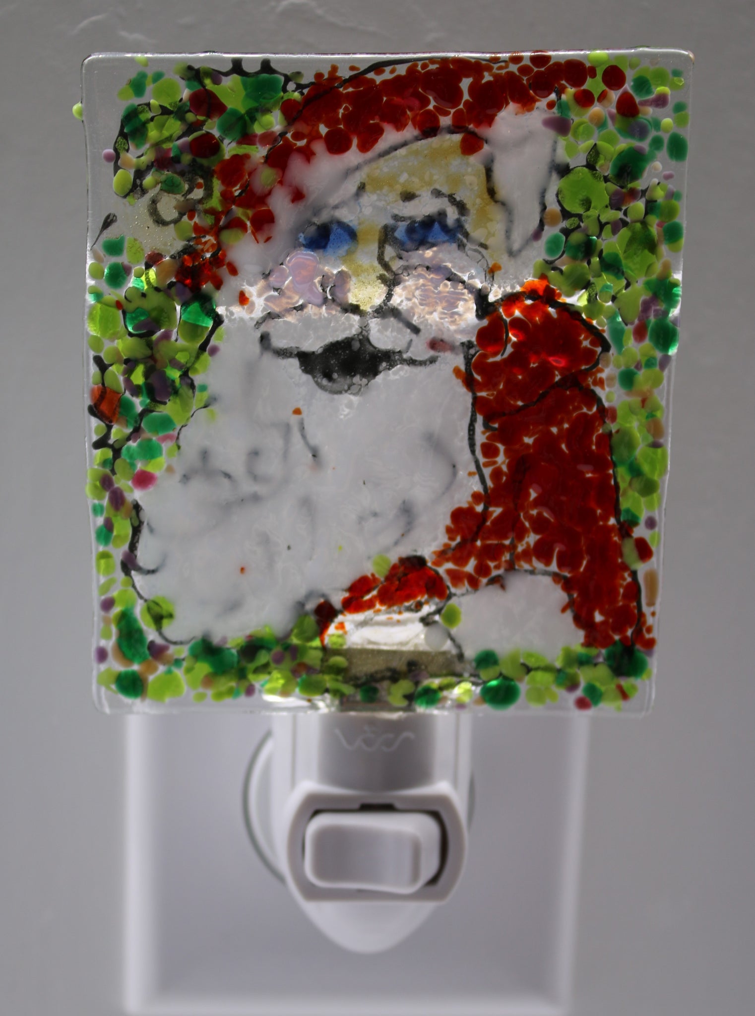 Santa nightlight created by drawing image on clear glass.  Red, amber, champagne,  white and clear frits and powders used to bring him to life.  Whimsical and fun.  Size is 3.5 x 3
