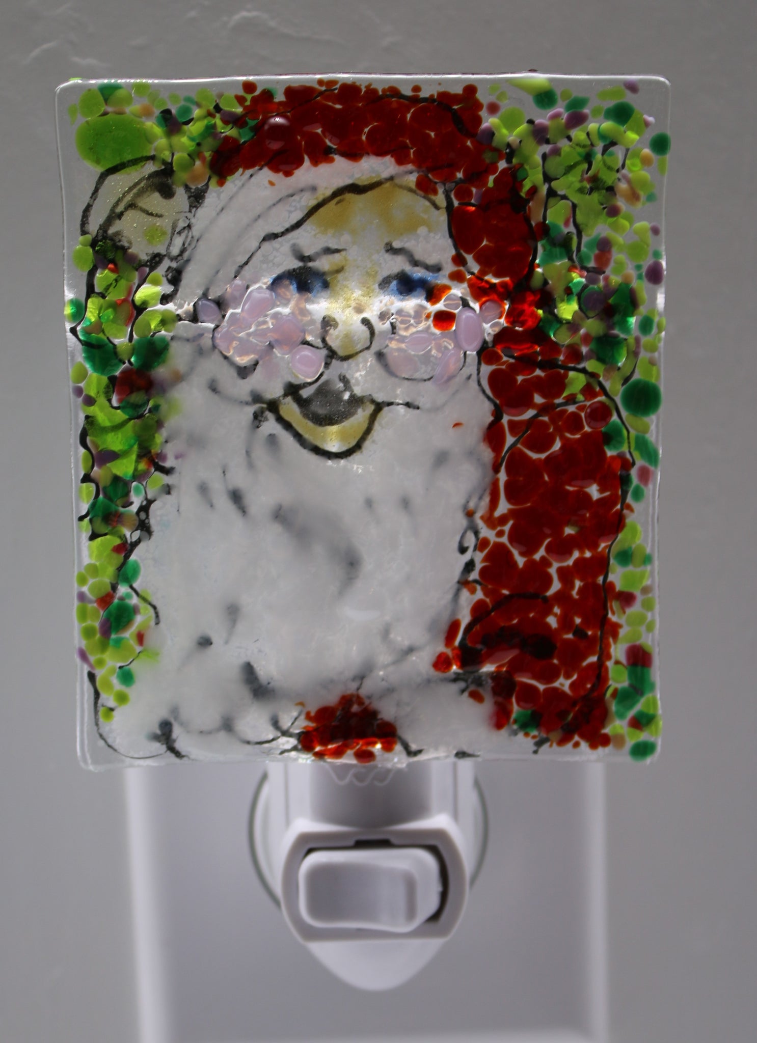 Santa nightlight created by drawing image on clear glass.  Red, amber, champagne,  white and clear frits and powders used to bring him to life.  Whimsical and fun.  Size is 3.5 x 3