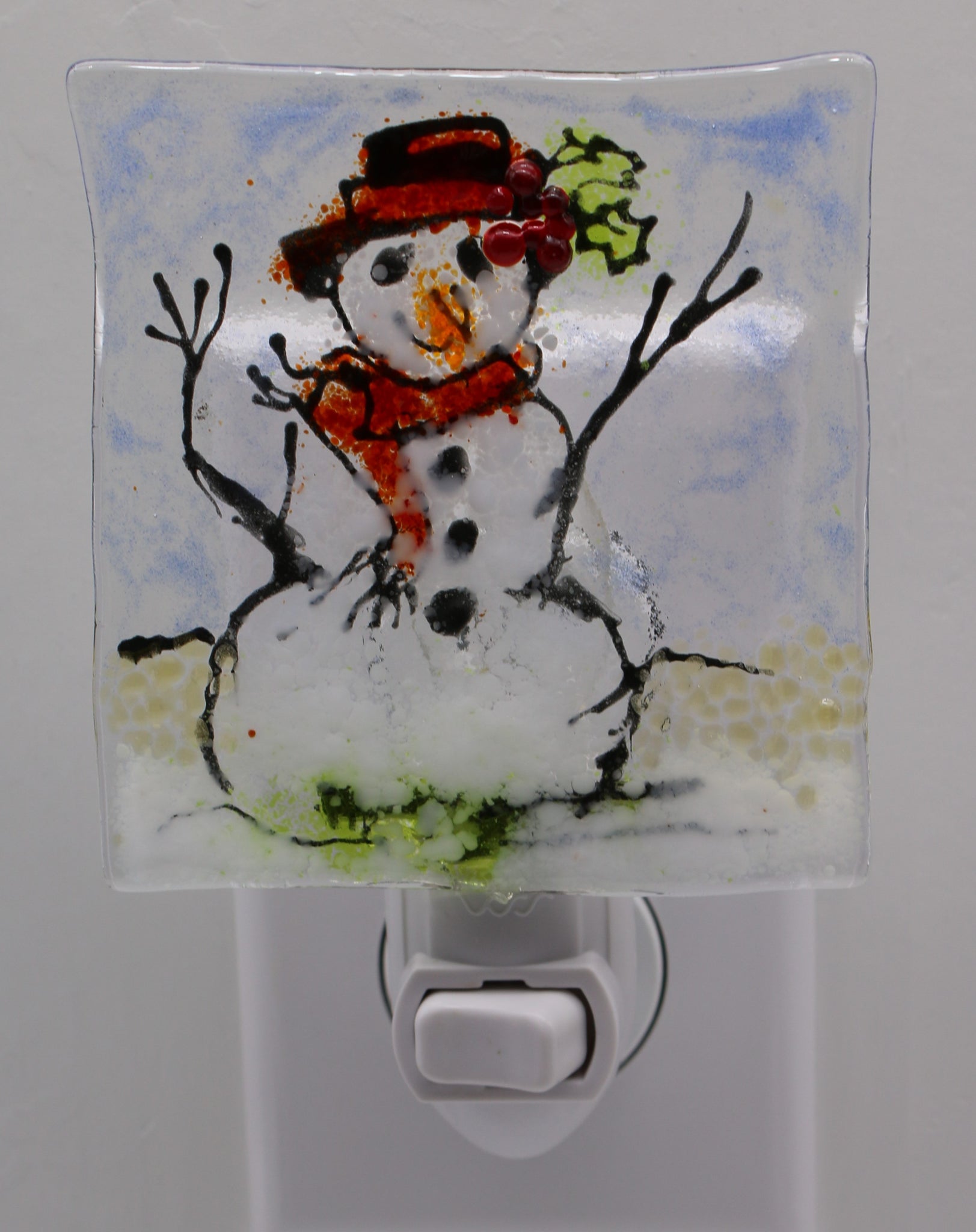 Snowman created on clear glass with hat and scarf, Small red berries on hat. Blue, green, red, white and gold frit complete the scene. Whimsical and Fun. Size 3 X 3.5