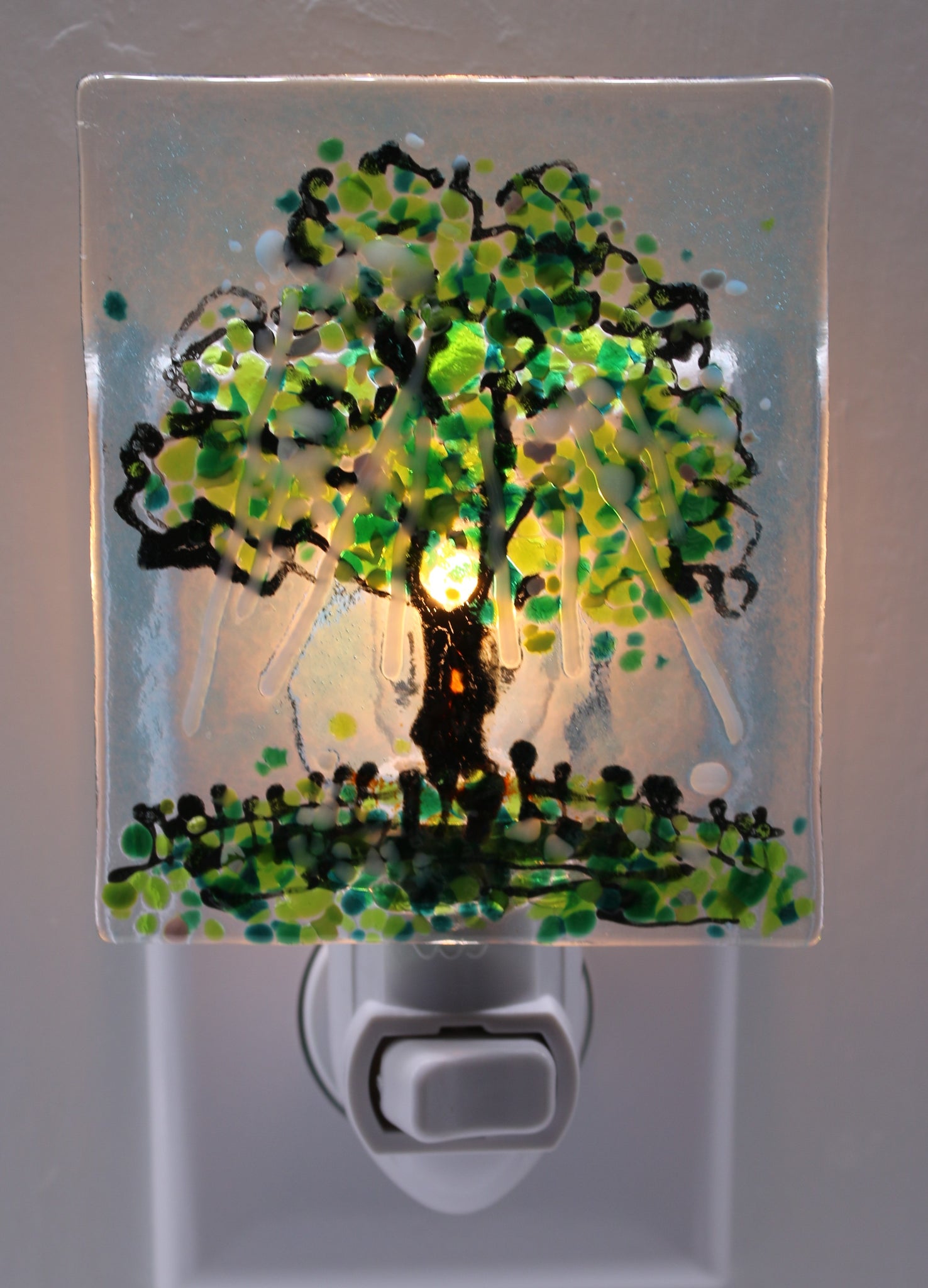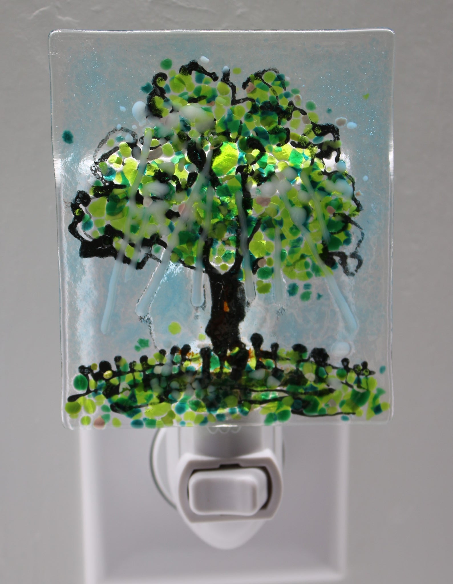 Drawn oak tree to depict tree on Toomer's Corner in Auburn.  Green frit with white frit and rods placed on tree depicting paper thrown into tree.  Sky sprinkled with Blue powder and grass created with yellow and green frit. Amazing when lit up and as beautiful when turned off. Whimsical and fun.  Size 3 x 3.5
