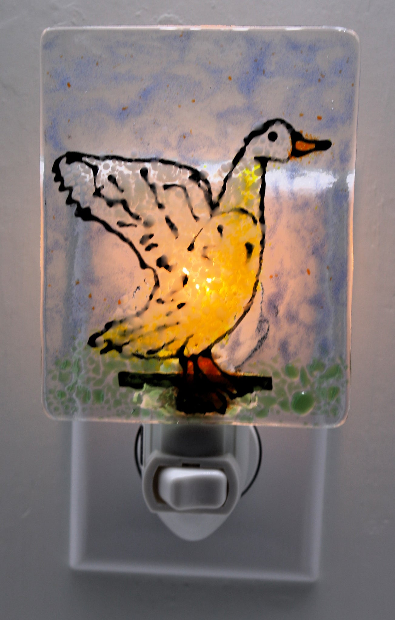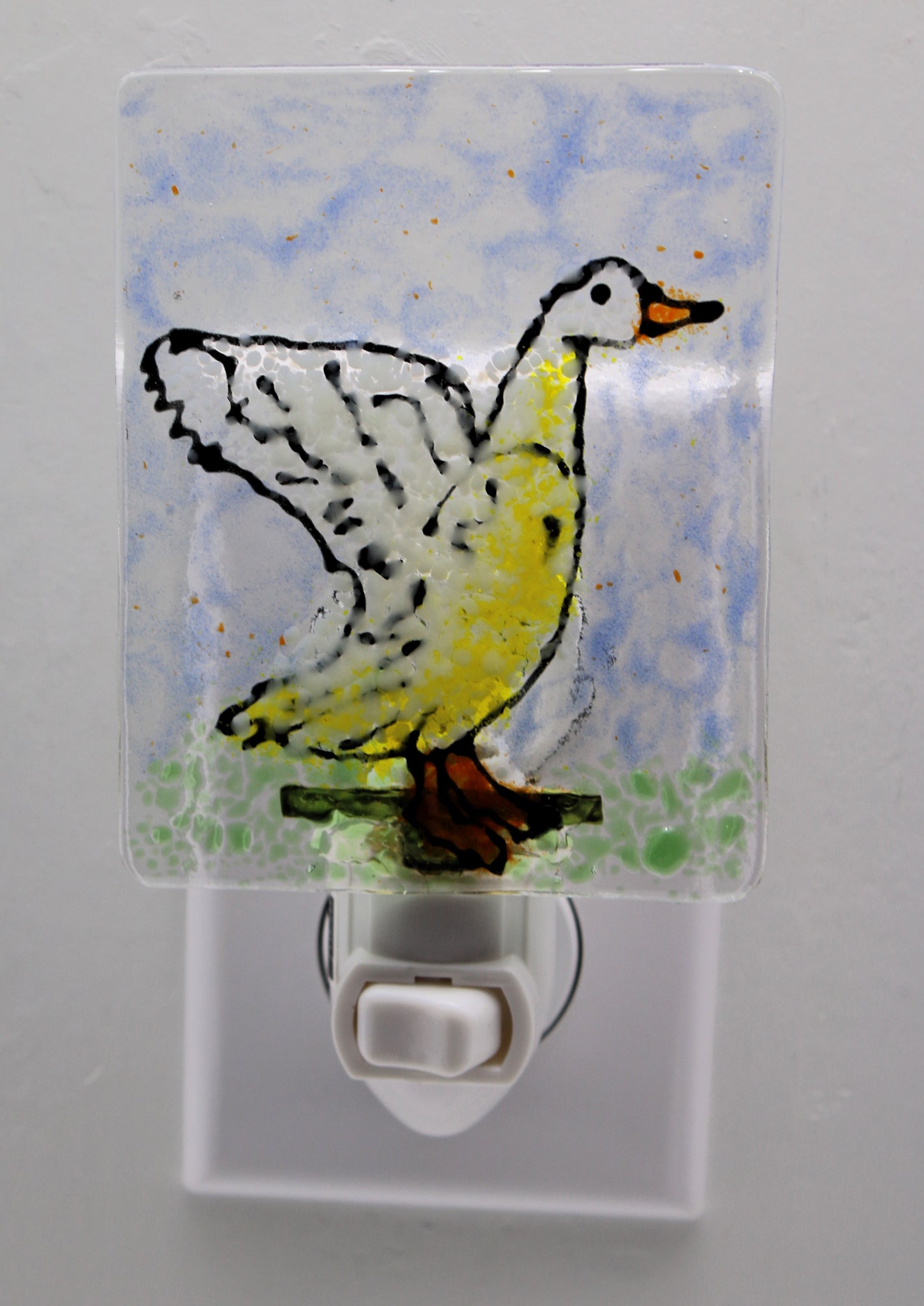 White and yellow duck drawn on clear glass. White, Yellow, Green and blue frit bring scene to life. Whimsical and fun night light. Size 4 inch tall by 3 inches wide.