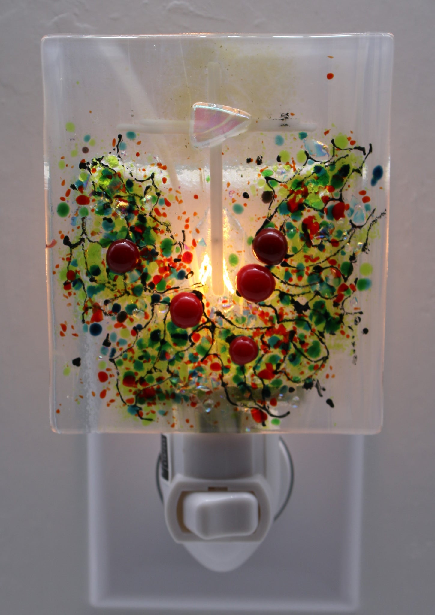 White Cross placed on white streaky glass with dichroic piece in middle of cross  Drawn holly leaves and red berries surround the cross. Size 3 x 3.5 -   Serene and Beautiful.