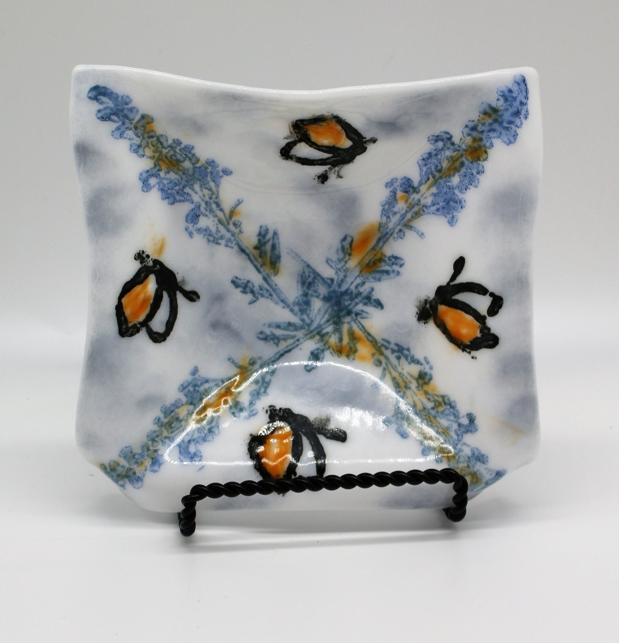 6 x 6 white dish stamped with blue flowers and black butterflies. Beautiful display piece or functional serving dish.