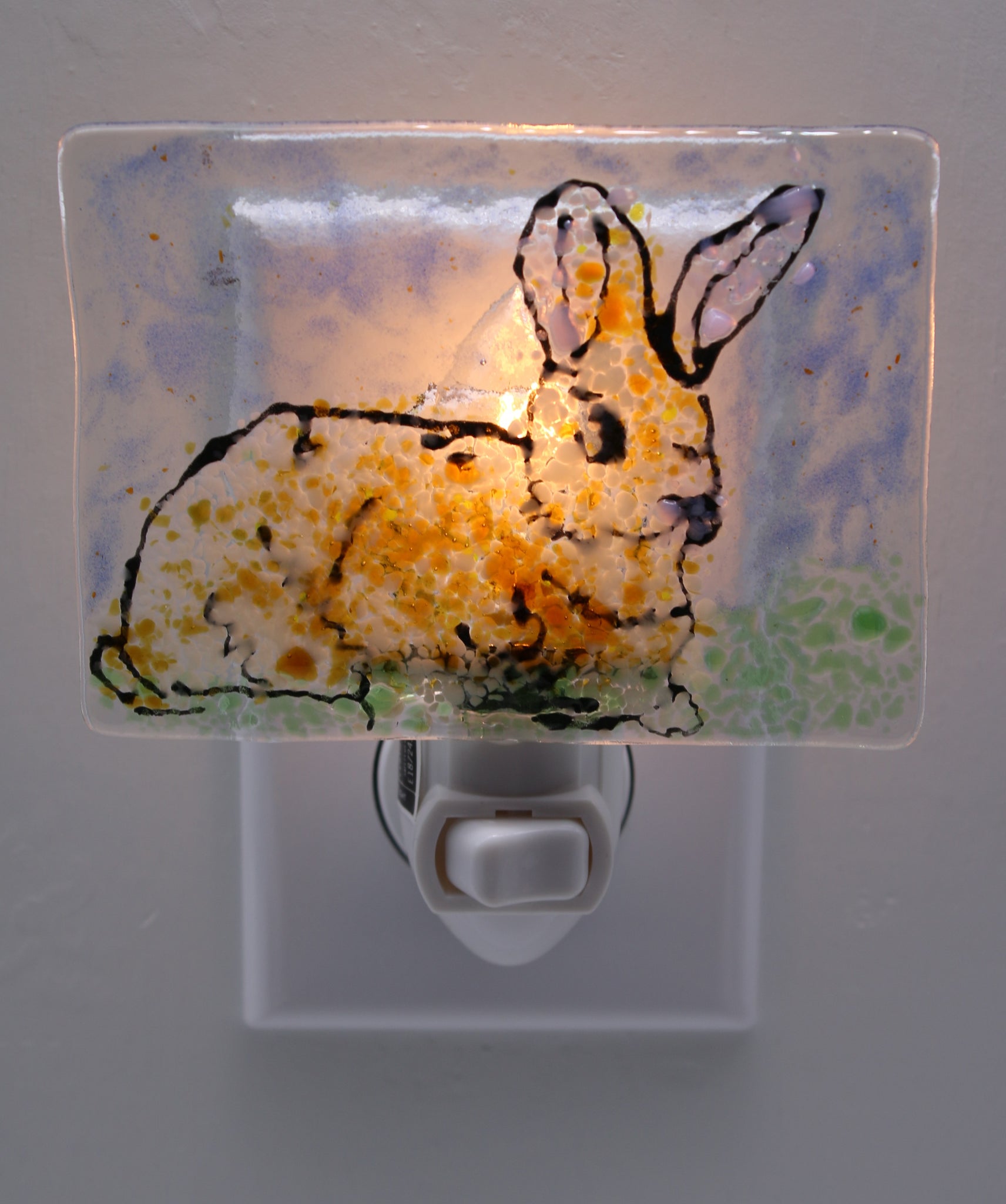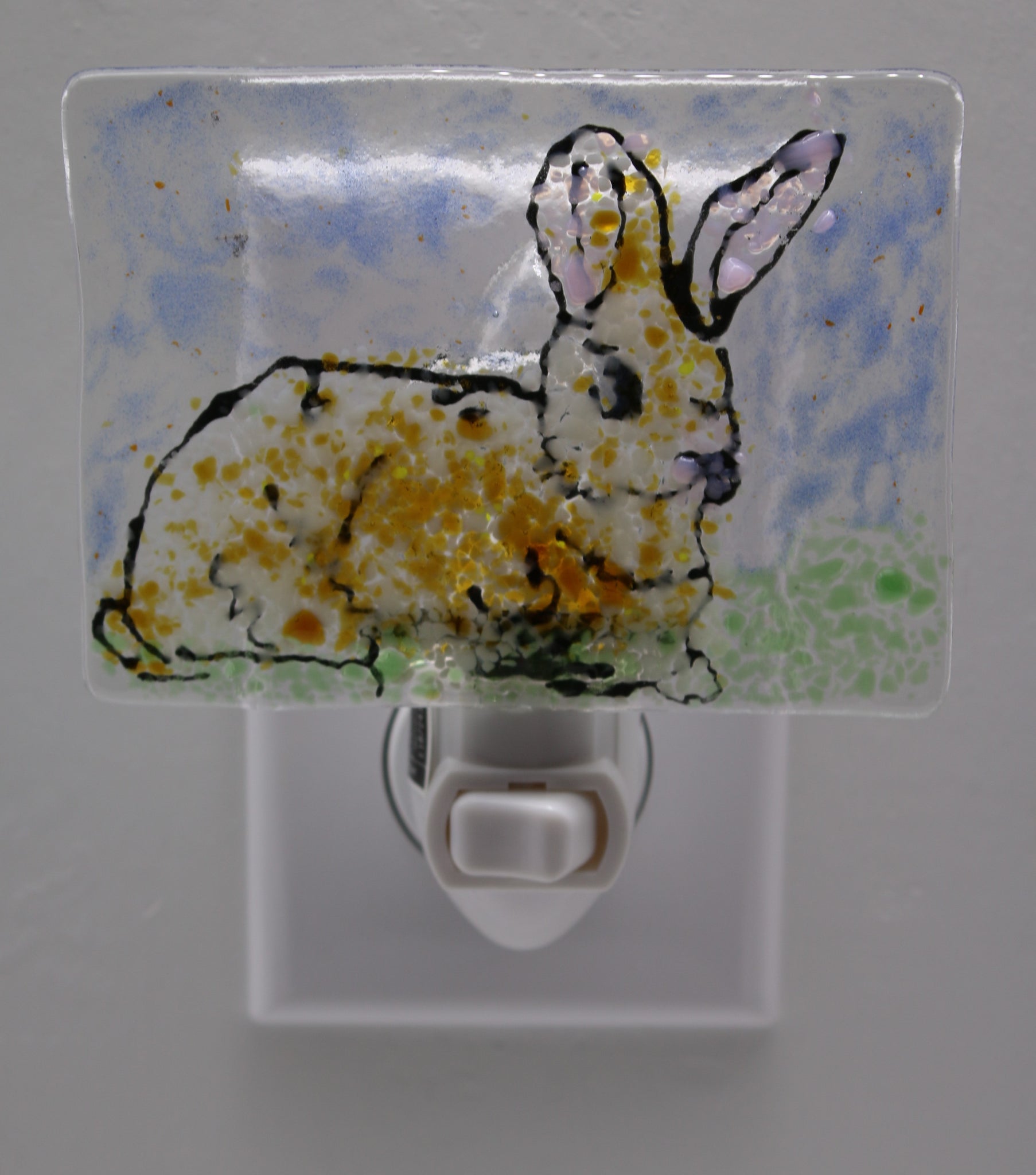 White Rabbit drawn on clear glass. White, pink, green and golden frit used to complete the scene.  Whimsical and fun night light.   Size 4 inch tall  by 3 inches wide.
