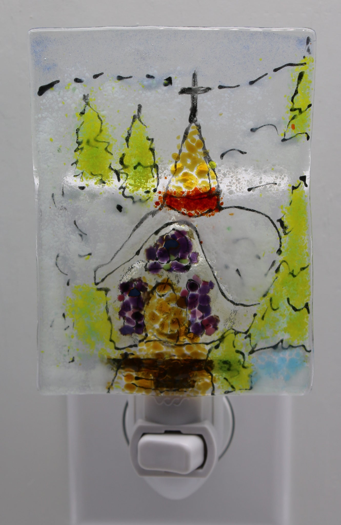 Church in snow drawn on clear glass.  White, red, purple, yellow and green frit complete the scene. Just as beautiful when turned off as when turned on.  Size 3 x 4