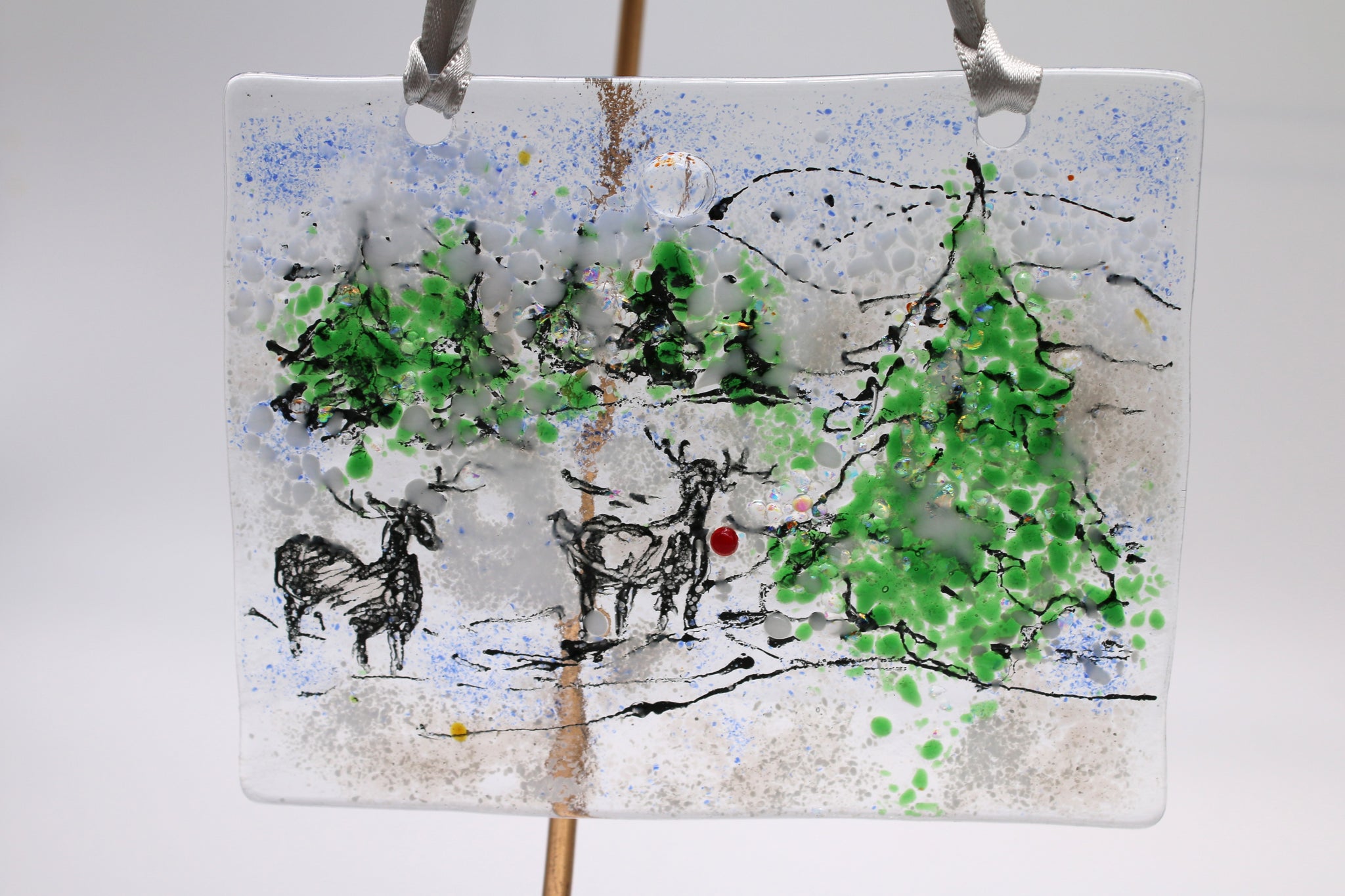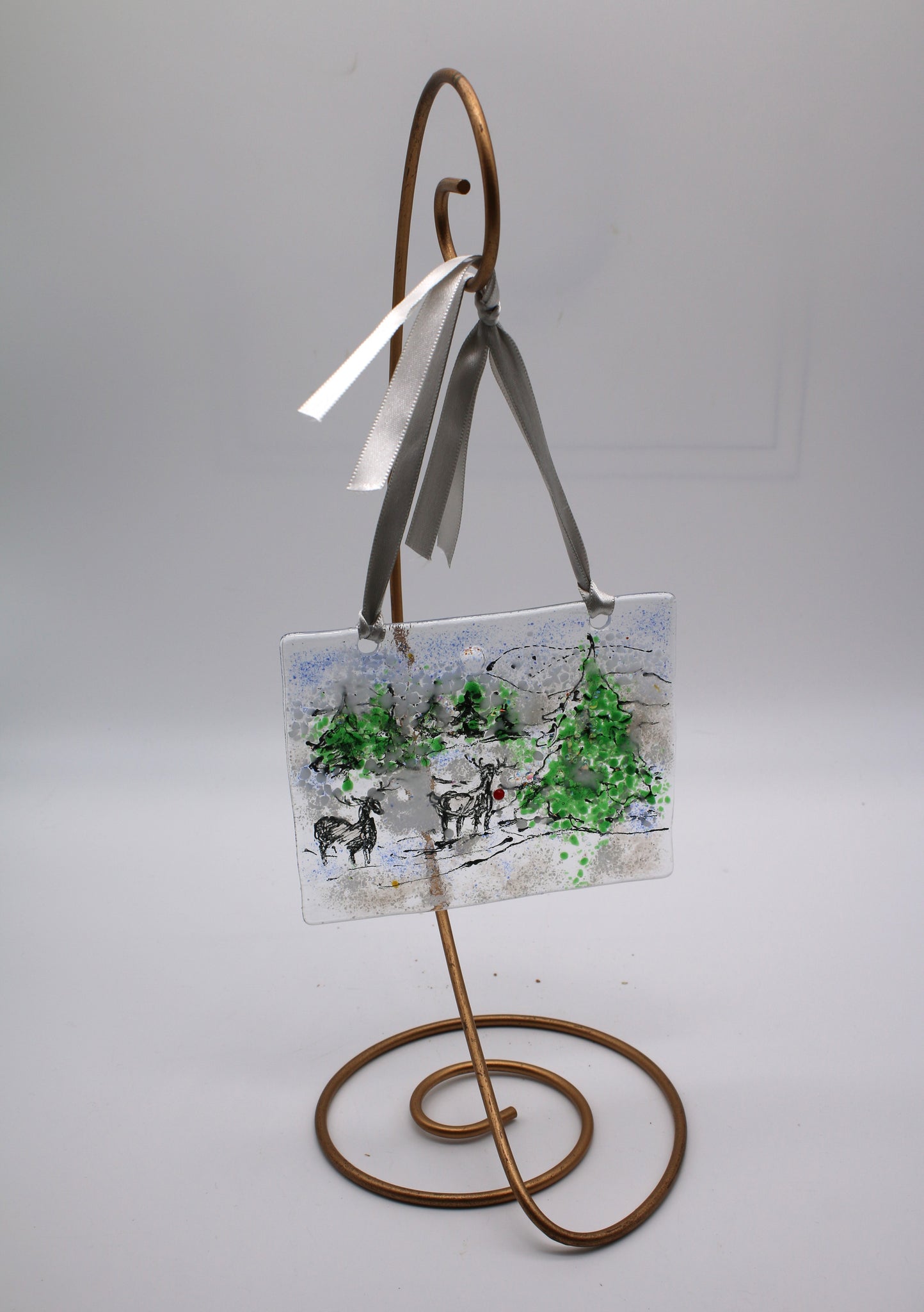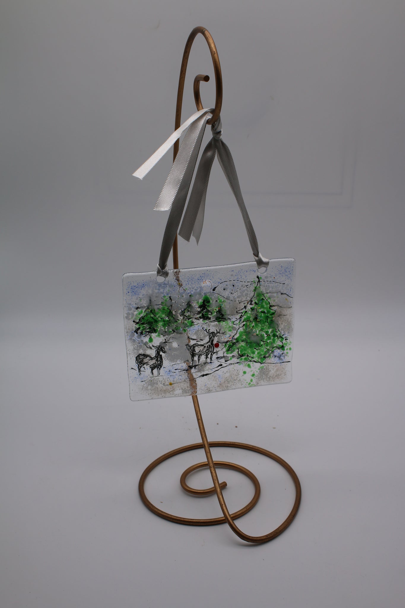 5 x 4 Drawn winter scene completed with green trees and two drawn deer. Serene scene. Beautiful display for any window.