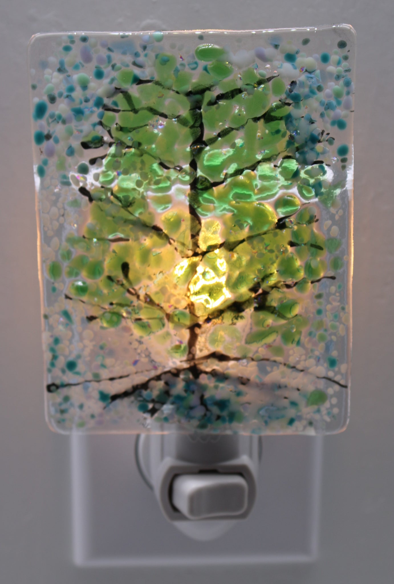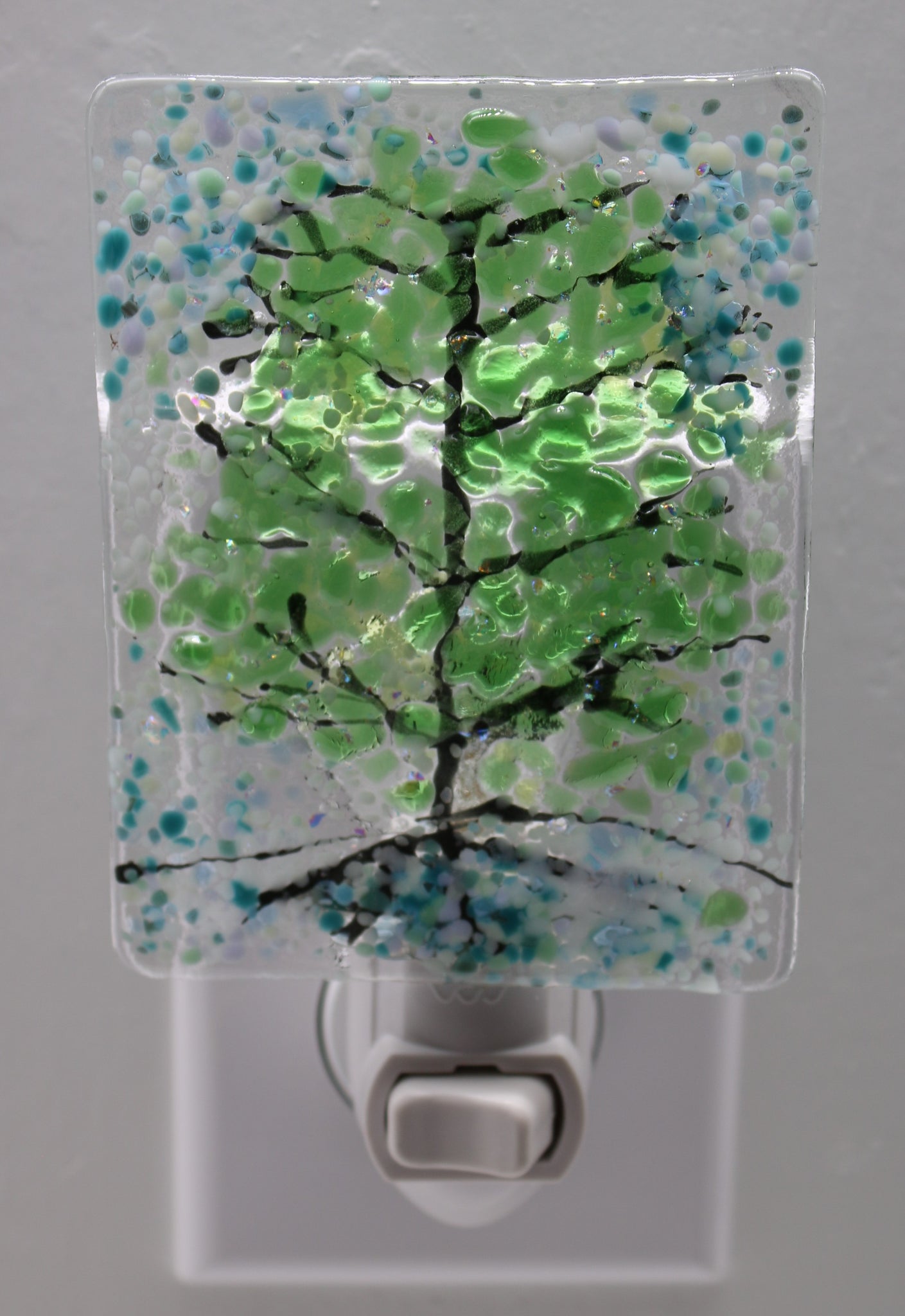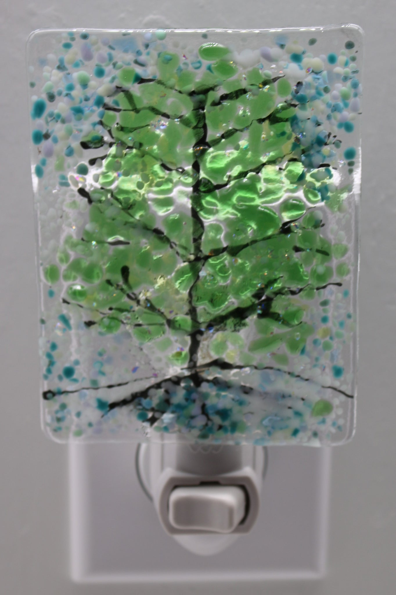Tree drawn on clear glass. Branches filled with mixed green frit. Mixed blue frit sprinkled around sky and ground with sprinkled white frit sprinkled on top of this too complete the scene. Just as beautiful when turned off as when turned on. Size 3 x 4