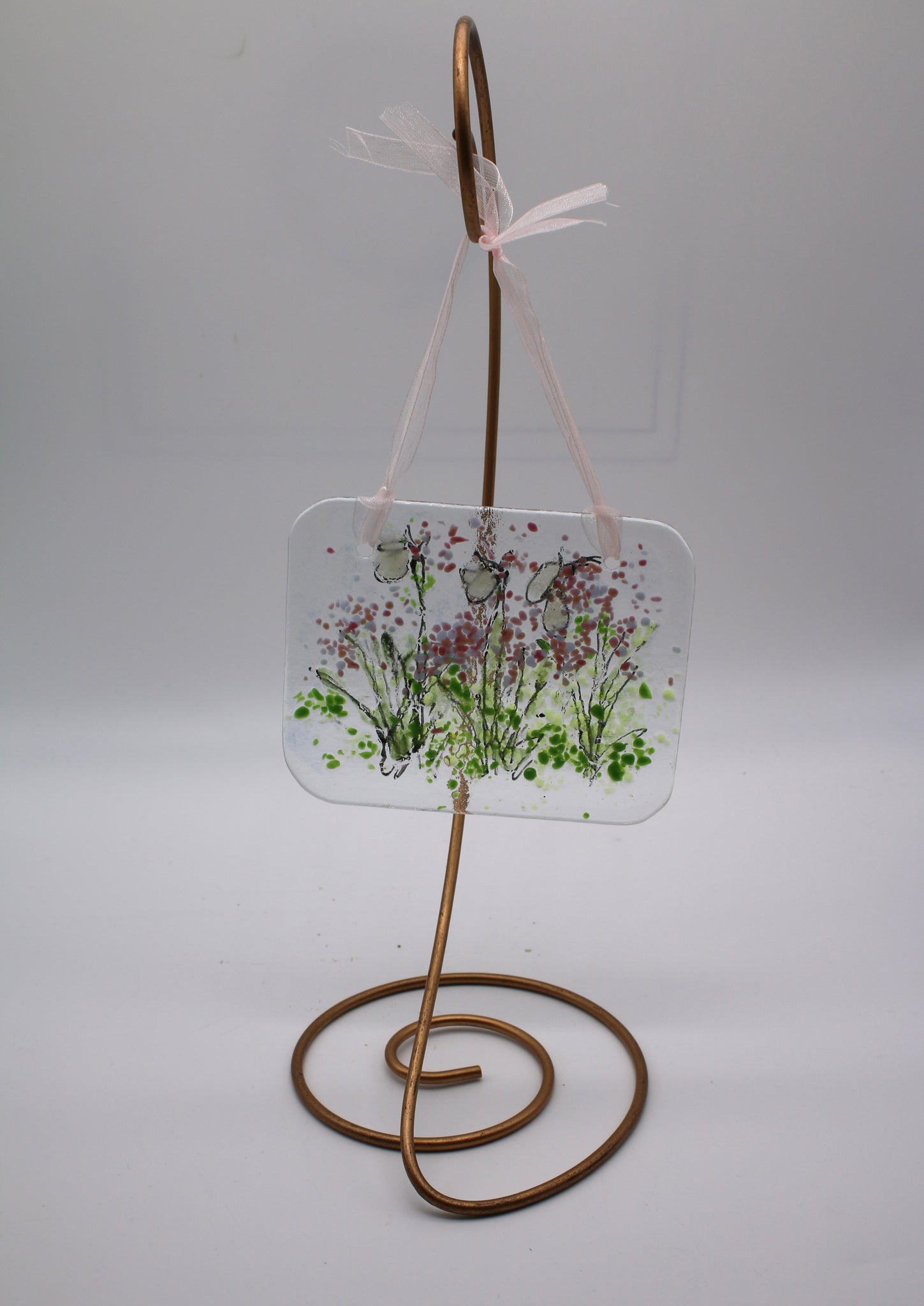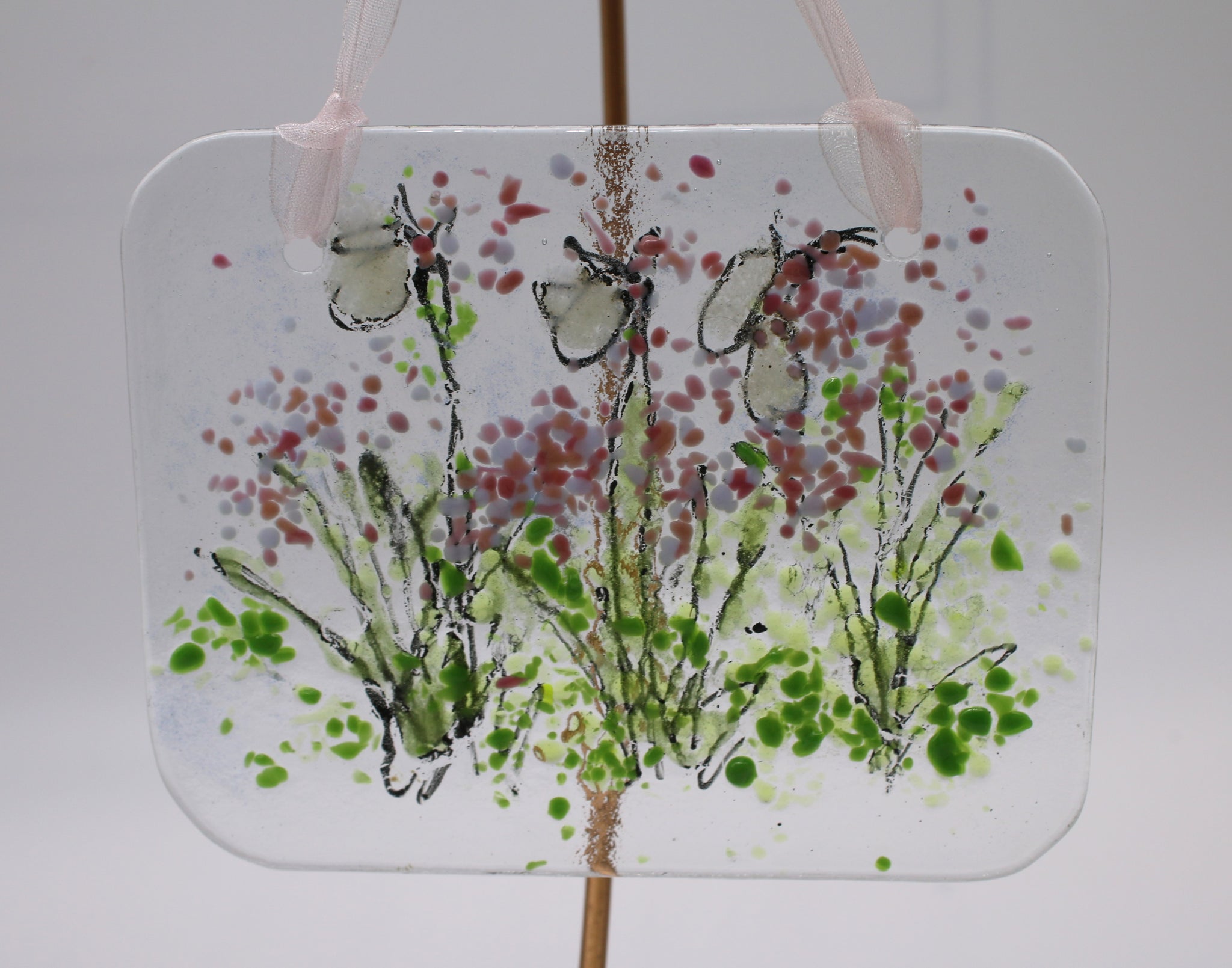 5 x 4 Drawn summer scene completed with green, yellow, pink, white and blue powder and frit. Serene scene. Beautiful display for any window.